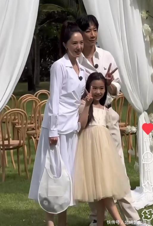 值得一提的是董璇女儿还现场给路人送礼物,应该是很开心有一个新爸爸,小姑娘还挎着一个布包,面对镜头不怯生,而且很有镜头感,这都与明星妈妈的培养分不开。 再来看新婚后董璇拍的全家福,新婚老公挽着岳父个别,对镜头比V很帅气,小酒窝站在新爸爸前面也开心,灿烂的笑容足以说明与新爸爸相处融洽。