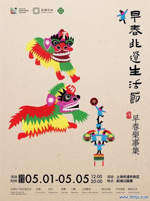 5月1日至5日,早春乐事集第26回、早春非遗生活节将在浦东新区前滩公园巷和晶耀前滩举办。早春乐事集是一个专注呈现全国各地非遗物产的市集,去年在上海举办的非遗手工节大受欢迎,这次在五一期间带来早春非遗生活节,以非遗手艺在生活中的创新呈现为主题,将有108位非遗创意人士参与。5月1日至4日,每天将有15:30、18:00、19:30三个时段,由福建宁德线狮少年队与上海马桥手狮舞队在前滩公园巷联袂呈现非遗剧场“线狮少年”。